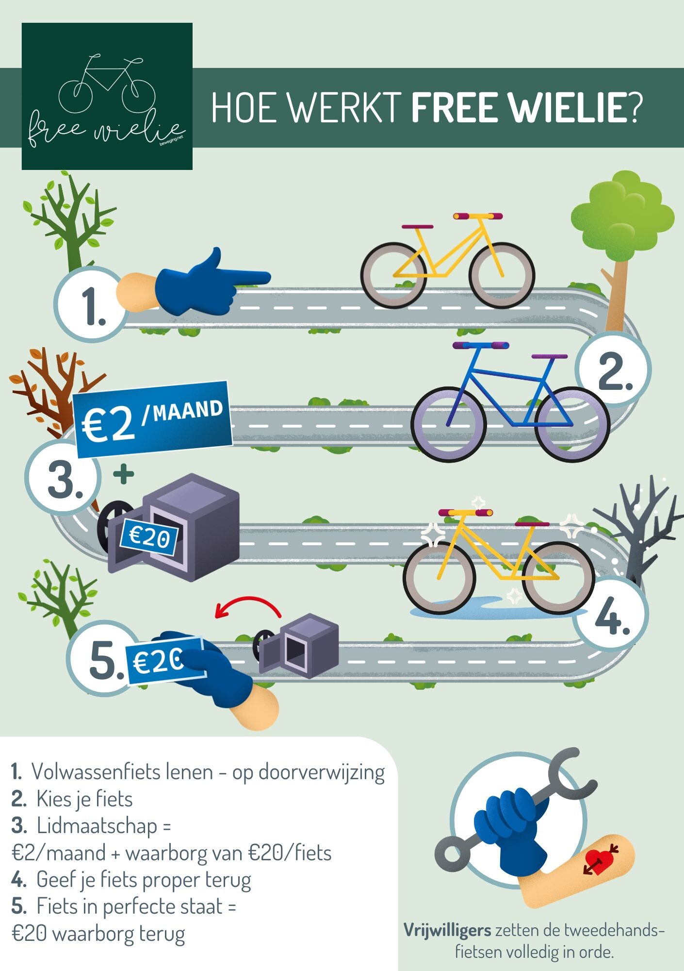 (*) Opgelet: niet iedereen kan een fiets lenen bij Free Wielie. Dit project is er enkel op basis van doorverwijzing via bepaalde instanties en organisaties.
